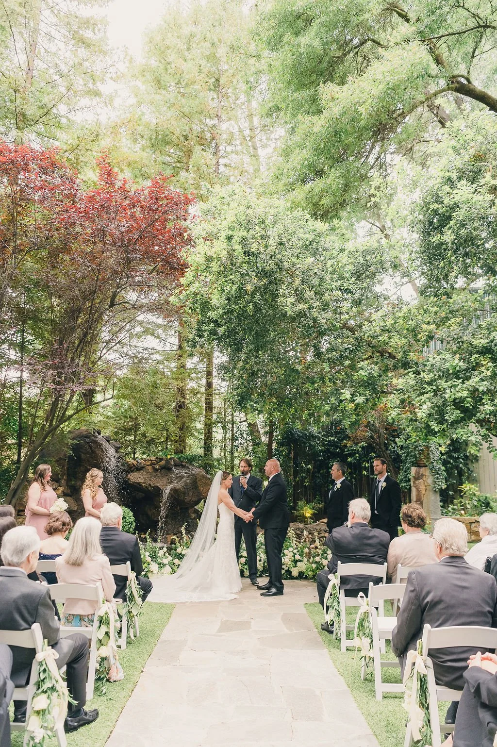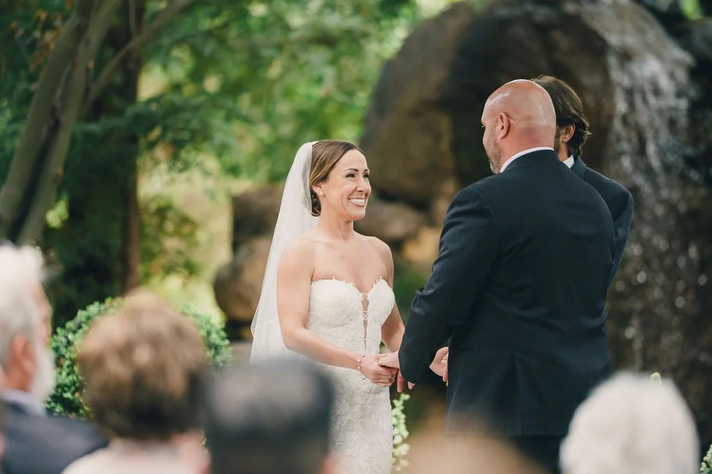 At this wedding, the nearby waterfall created more ambient noise than expected, which made lavalier microphones difficult to use. To keep the ceremony clear and easy for guests to hear, we switched to a handheld microphone.